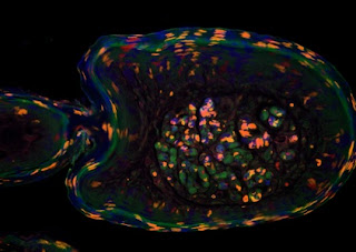 Weissman’s work with postdoctoral scholar Yuval Rinkevich, who was first author on the paper, shows that during digit regeneration in mice, the third model is not the right one. Remaining skin cells only make new skin cells, bone cells only make new bone. This comes a bit as a surprise, as this appears to be very different from the blastema mechanism thought to be used by salamanders to regrow their limbs. However, recent experiments from Elly Tanaka’s group in Dresden have challenged that long held model, showing that blastema cells in regrowing salamander legs do not typically adopt fates different from those of the cells they’re derived from. These studies then suggest that regeneration of limbs and digits in salamanders and mice, respectively, does occur through related mechanisms, just not the one originally thought. In both cases, repopulating cells do not switch cell fate, but whether regenerated digit or limb cells are derived from tissue-specific stem cells or from mature cells remains an open question for both species, although the Weissman paper makes a cogent argument that their data are consistent with the stem cell model, at least for some of the cell types involved in mouse digit regeneration.